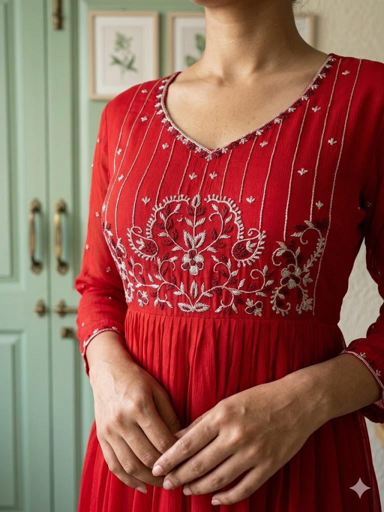 The rich red hue enhances its regal appeal, while the soft texture ensures comfort throughout the day. Paired with straight-cut pants for a balanced structure and a matching chinnon dupatta that adds fluidity and finesse, this ensemble is perfect for festive occasions, celebrations, and evening gatherings.