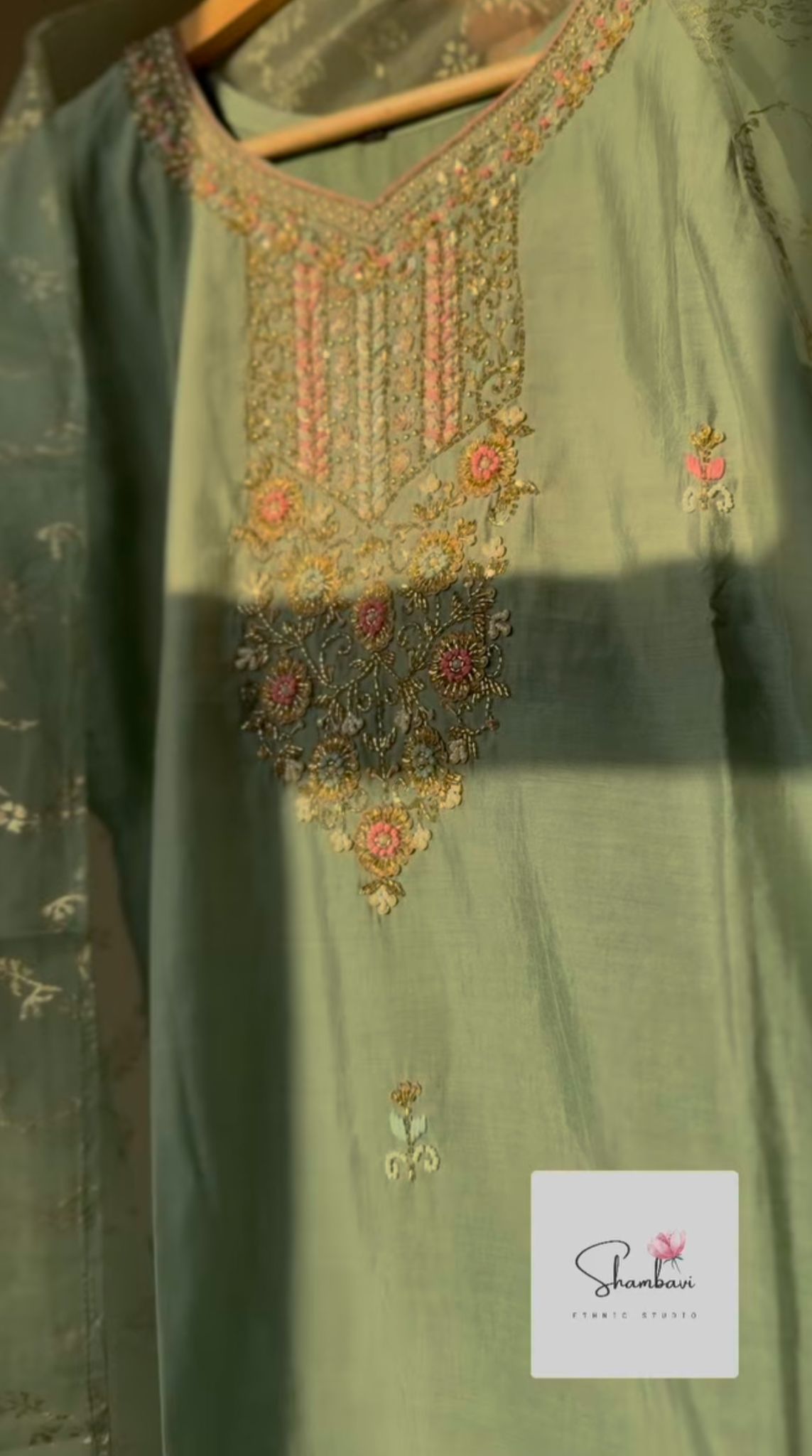 Elevate your wardrobe with this elegant sea green Roman silk three-piece suit, designed in a timeless straight-cut silhouette. The dress features delicate hand embroidery along the neckline, adding a refined touch of craftsmanship and sophistication.