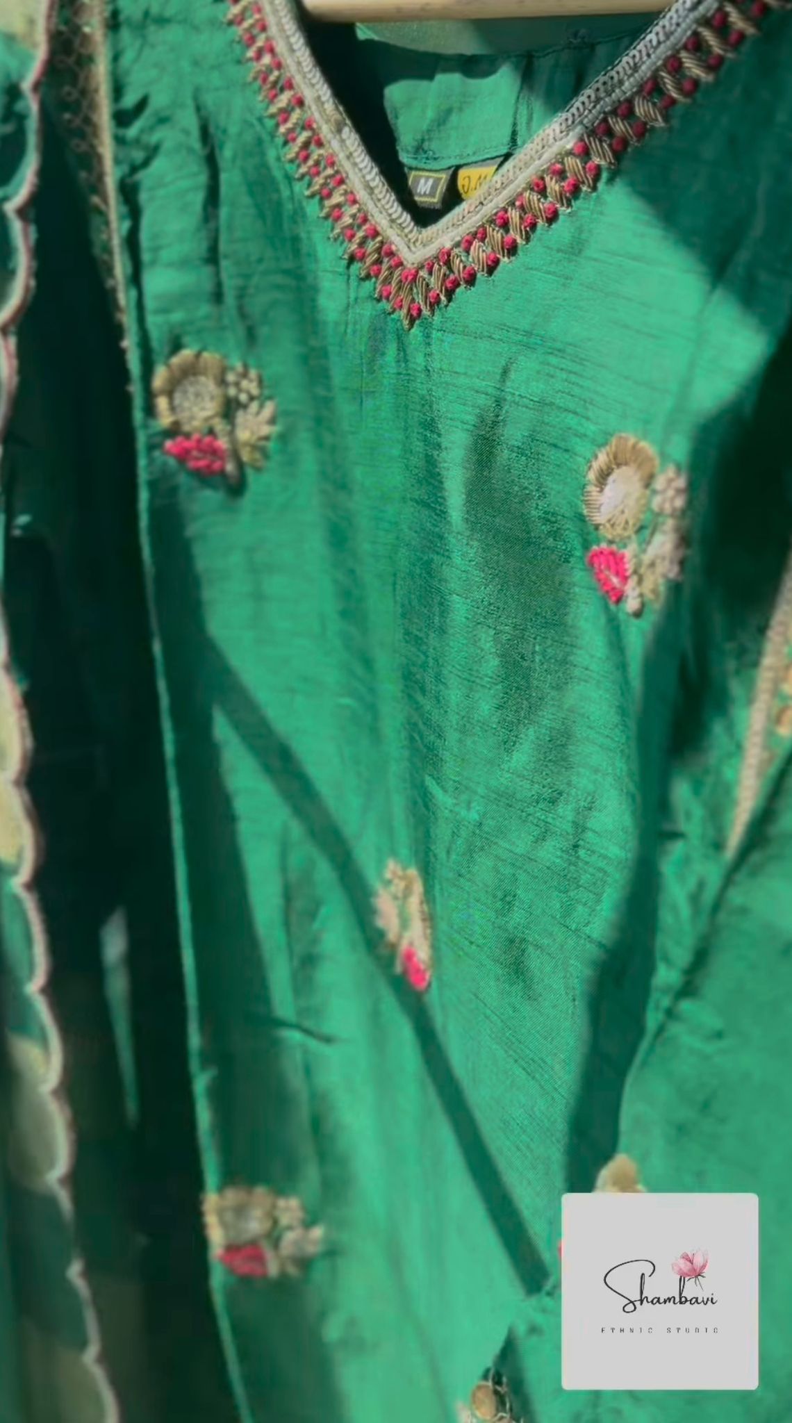 Step into elegance with this emerald green pure dola silk straight-cut dress, beautifully adorned with intricate hand-embroidered motifs spread gracefully across the fabric. The rich texture of dola silk enhances its luxurious appeal, making it a perfect choice for festive occasions and special gatherings.