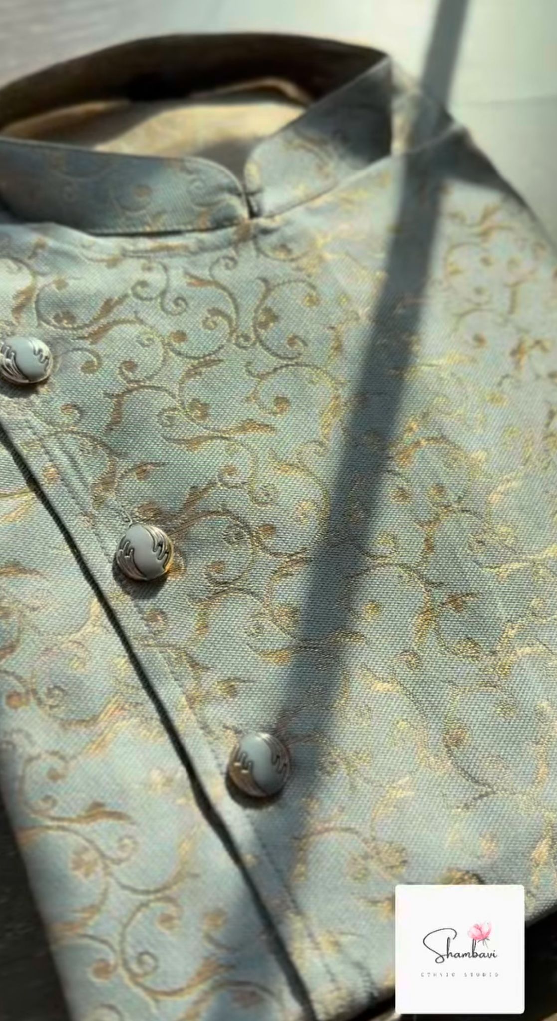 Crafted from premium fabric, this grey men’s designer kurta features intricate gold designs throughout the garment. It is finished with refined side-button styling and pairs effortlessly with white pajama pants for a polished occasion-ready look.
