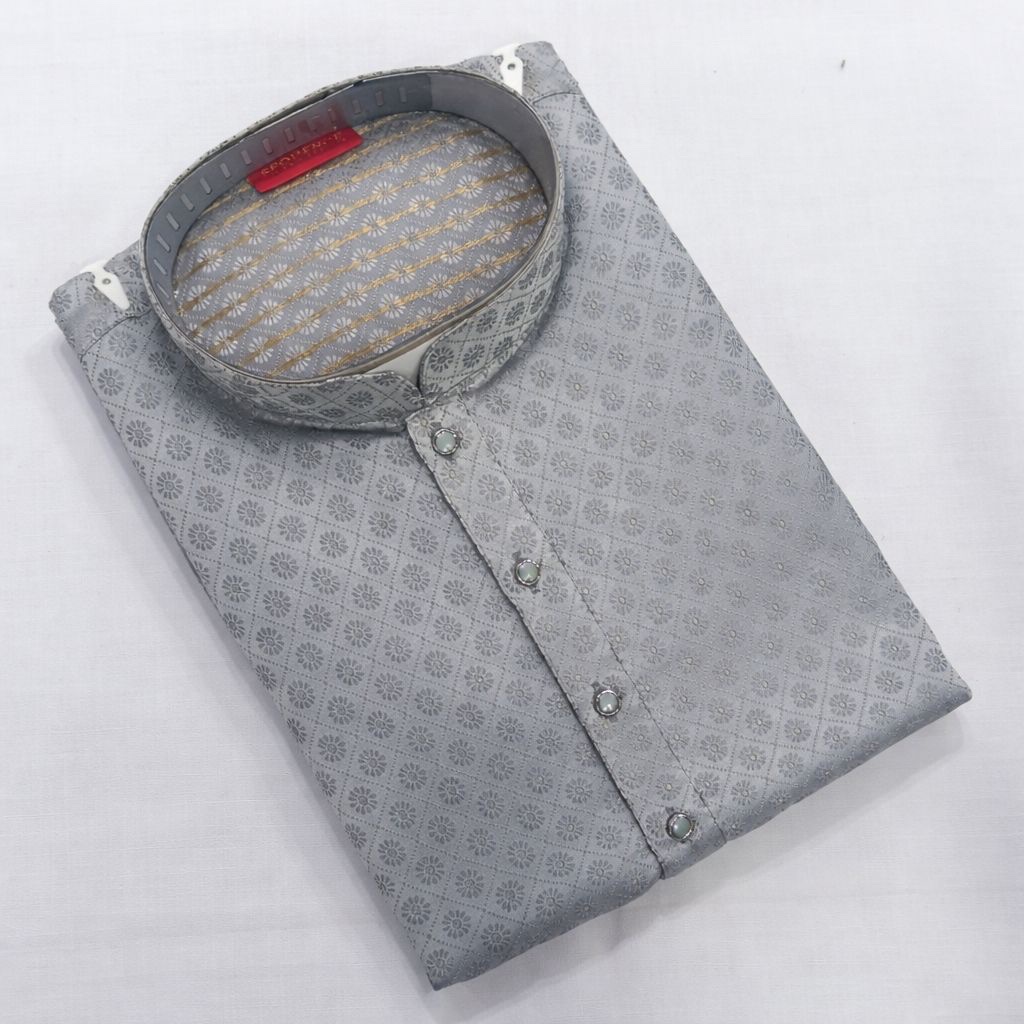 A sophisticated grey designer kurta crafted in silk, featuring an elegant self-design pattern all over. The rich texture and subtle detailing give it a refined, festive look while ensuring comfort and style.
