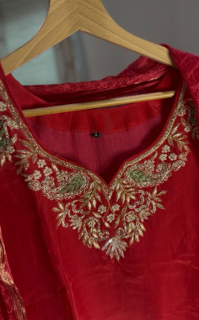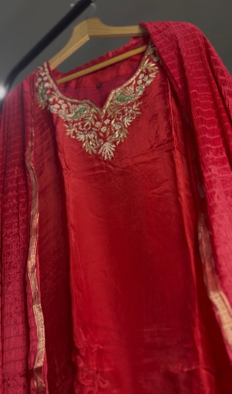 Make a statement with this stunning Hot Pink and Brick Pink Mix Pure Upada Silk A-Line Three Piece Suit, beautifully named “Gulnaar Blush.” Crafted from luxurious Upada silk, the kurta features heavy Zardosi embroidery on the neckline, adding a rich and regal touch. The outfit is further enhanced with delicate hand-finished edges, showcasing fine craftsmanship and elegant detailing.