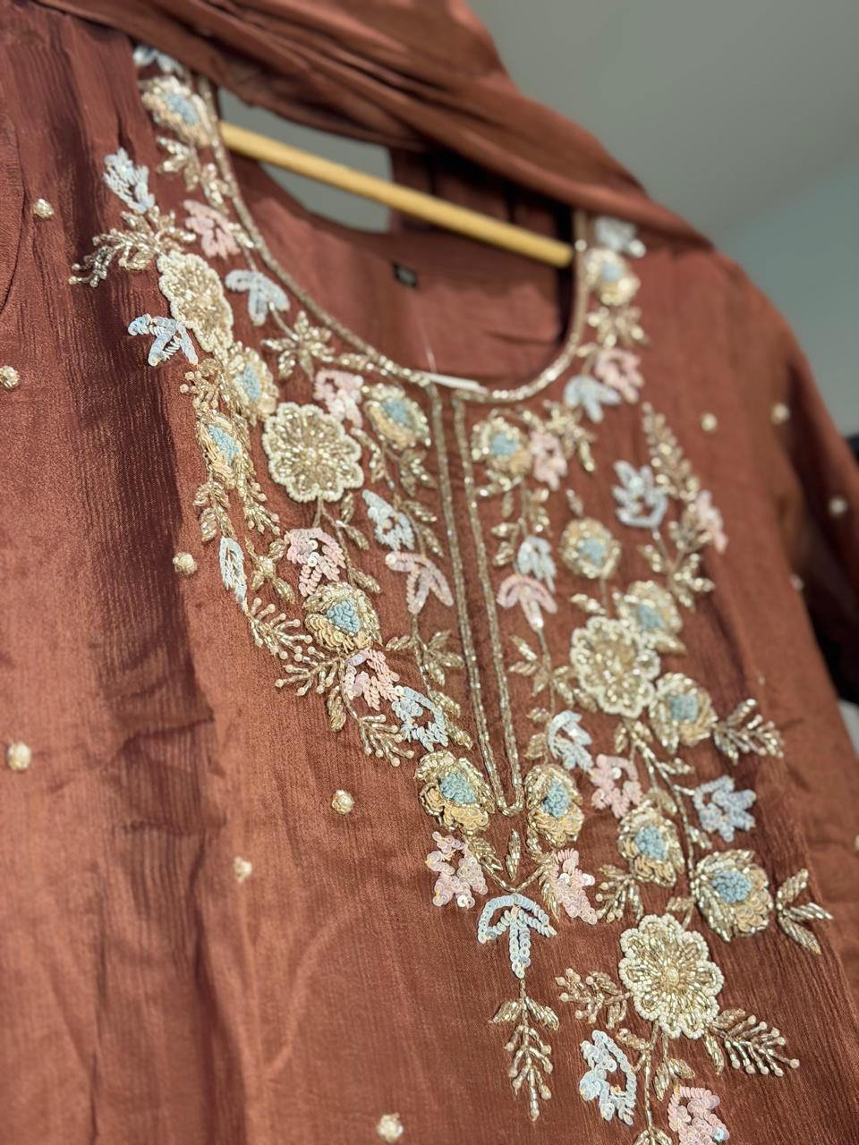 Midnight Mocha Elegance is a sophisticated three-piece suit crafted in rich dark coffee brown pure Chinnon fabric, offering a graceful blend of luxury and comfort. The kurta features intricate heavy hand embroidery on the yoke, showcasing detailed craftsmanship that adds depth and elegance to the design. It is paired with beautifully embroidered palazzo pants that create a flowing yet refined silhouette while maintaining ease of movement. The ensemble is completed with a matching Chinnon dupatta that adds softness and balance to the overall look. Perfect for festive occasions, celebrations, and evening gatherings, this outfit reflects timeless traditional artistry with a modern, elegant appeal.
