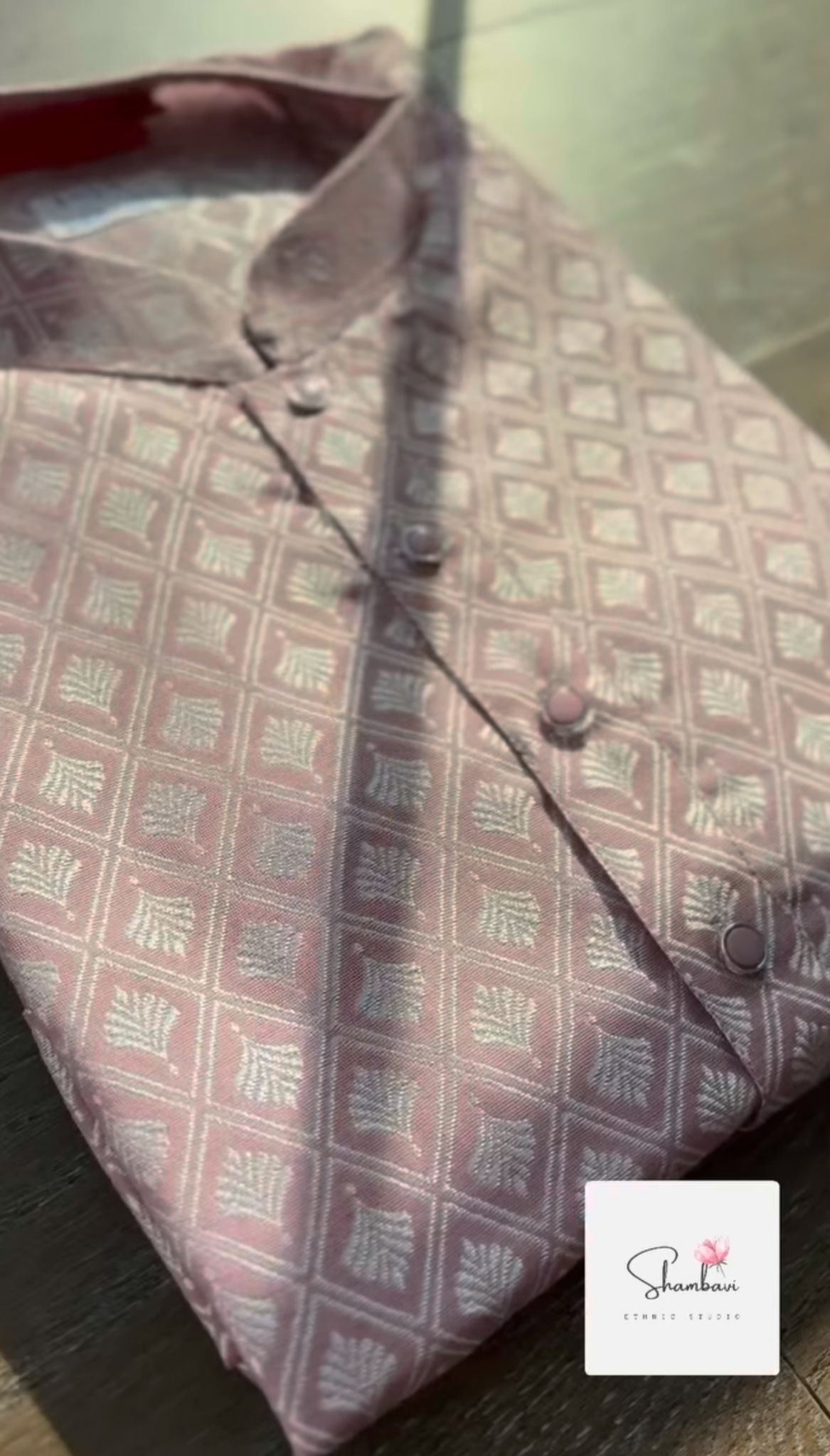 Crafted in a stunning onion pink, this men’s designer kurta features a unique self design all over. Comes with coordinating white pajama pants for complete ensemble. Perfect for special occasions and casual wear alike.