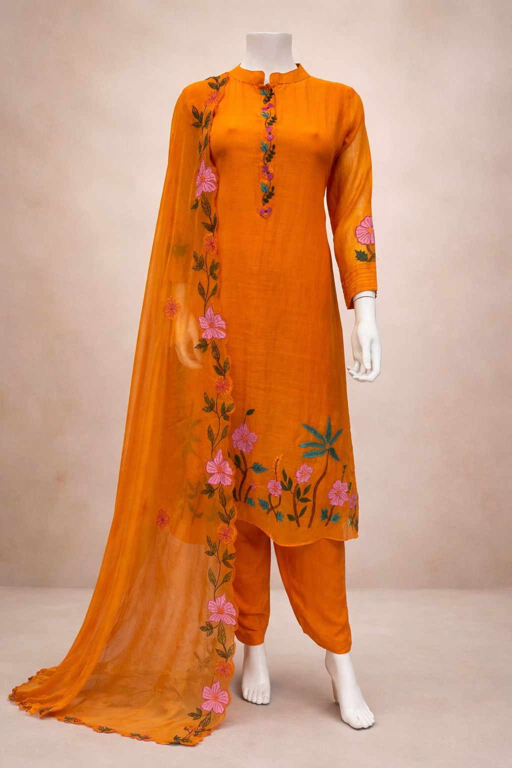 Elevate your ethnic wardrobe with this elegant three-piece suit set crafted from luxurious pure Banarasi Mul Chanderi fabric. Designed in a graceful A-line silhouette, the kurta features a sophisticated Chinese collar and delicate floral embroidery that adds a timeless charm.