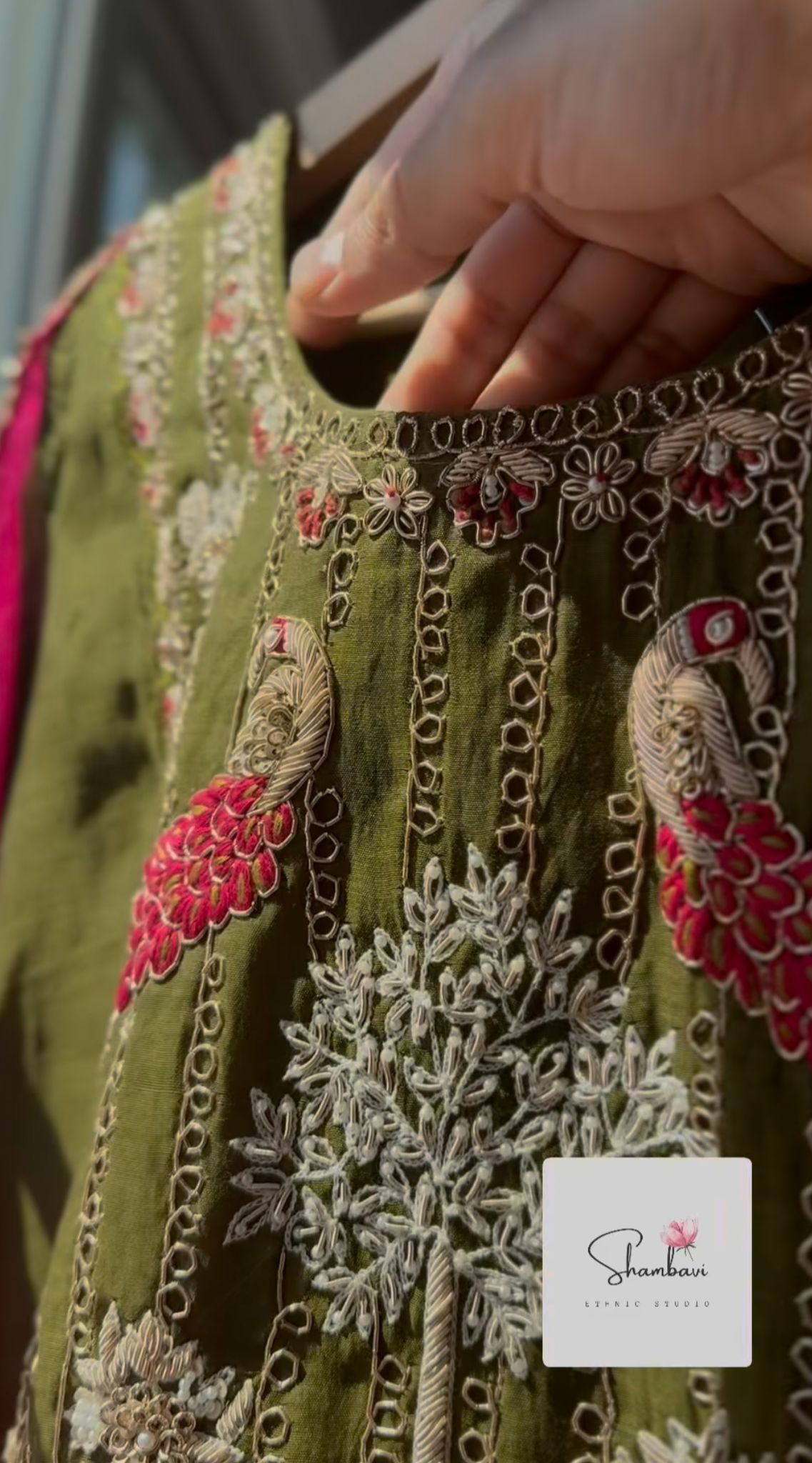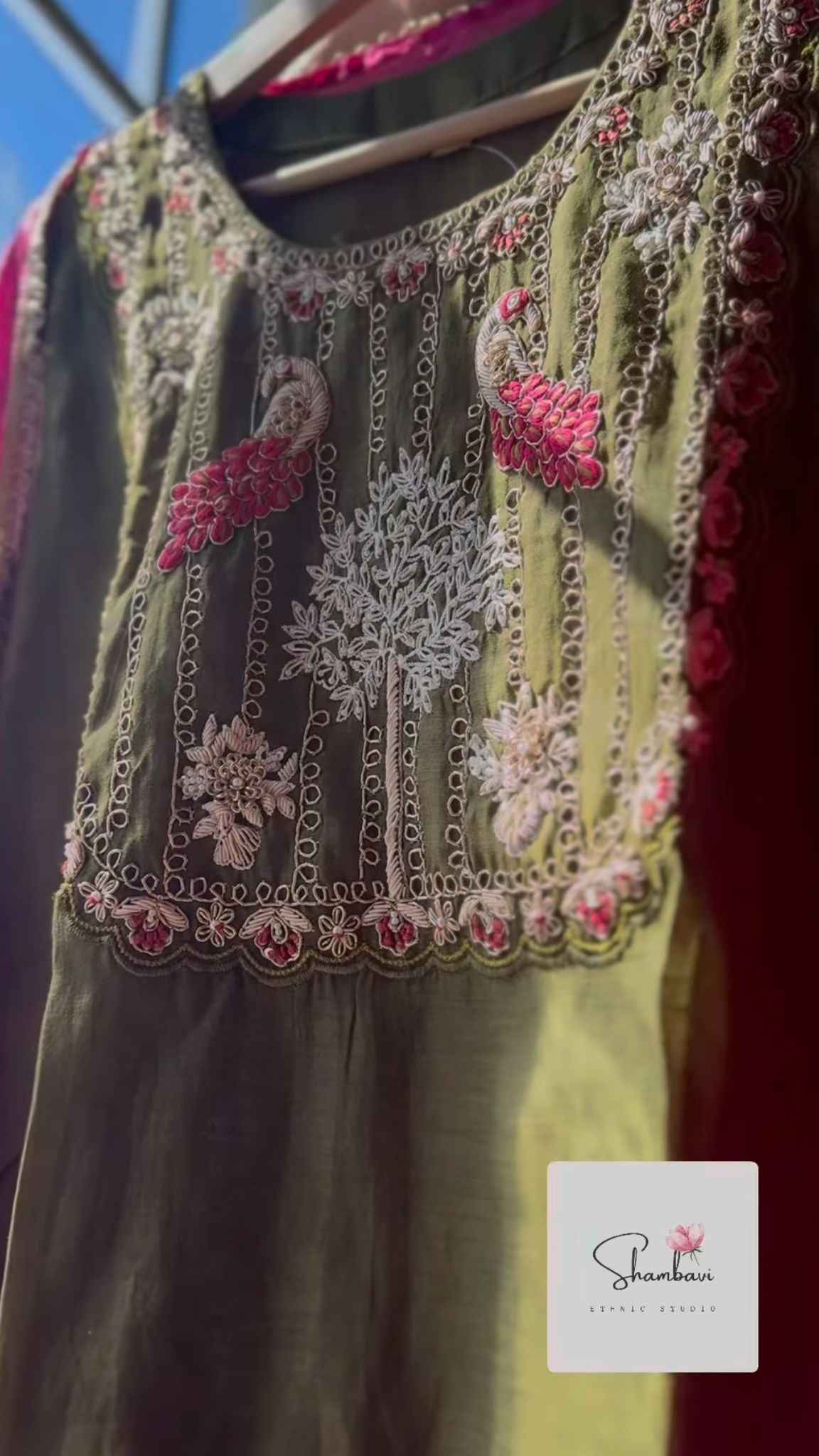 Pure Benarasi mul chanderi A‑line three‑piece suit in mehendi green, featuring heavy hand embroidery on the yoke. It comes with mehendi green straight‑cut pants and a contrasting rani pink mul chanderi dupatta adorned with cute motifs.