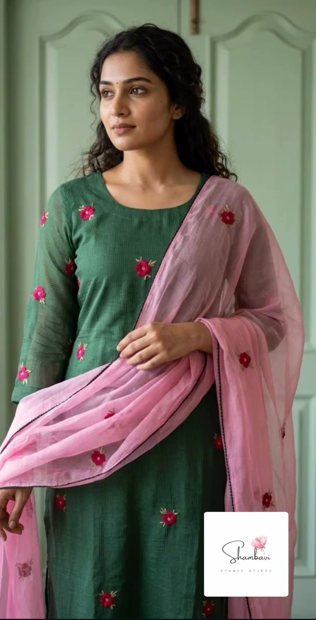 Pure Kota A-line dress in a beautiful bottle green and pink combination, adorned with delicate hand embroidery all over.