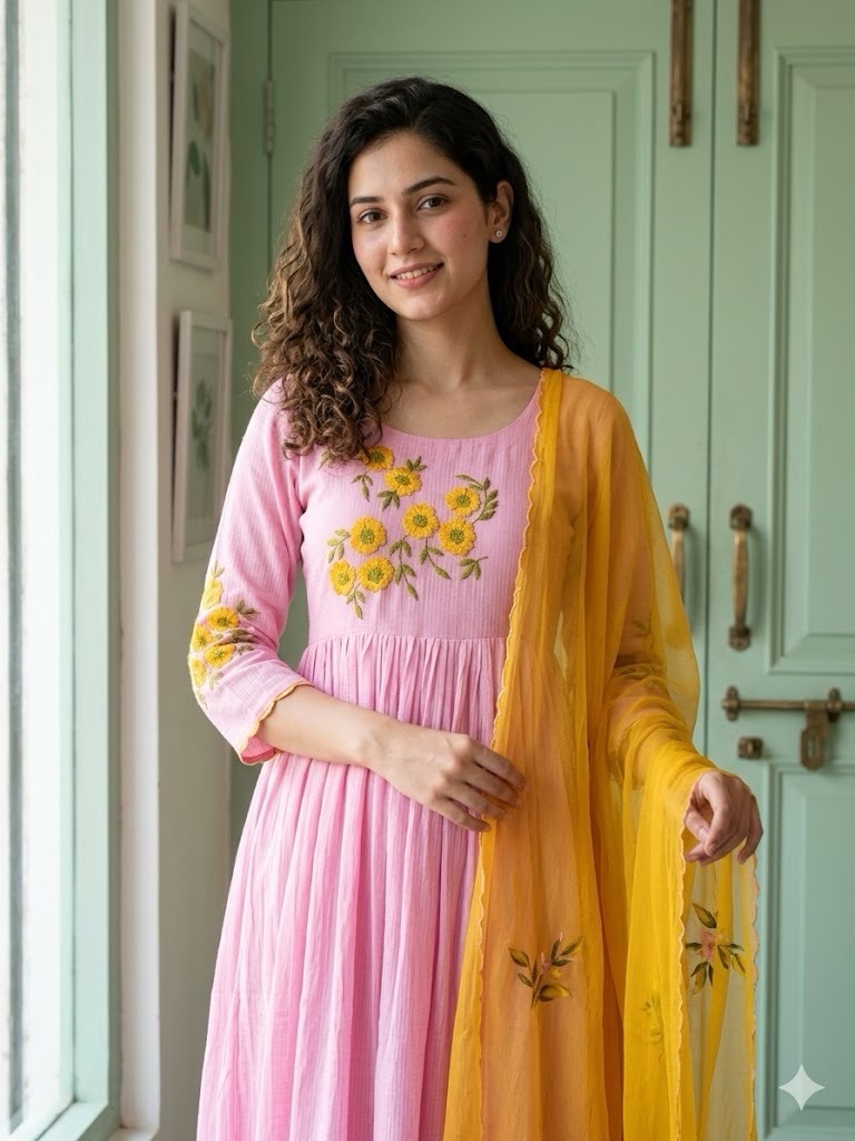 Elegant and timeless, this beautiful Anarkali set features a stunning pink and yellow combination crafted in pure linen kota fabric. The dress is adorned with heavy embroidery, adding a rich and festive touch.