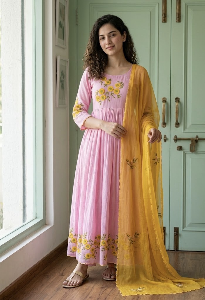 Pure Linen Kota Anarkali – Pink & Yellow Three-Piece Suit ✨