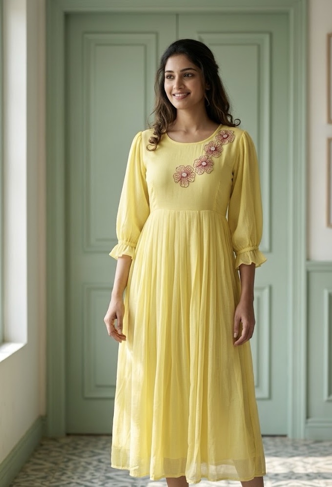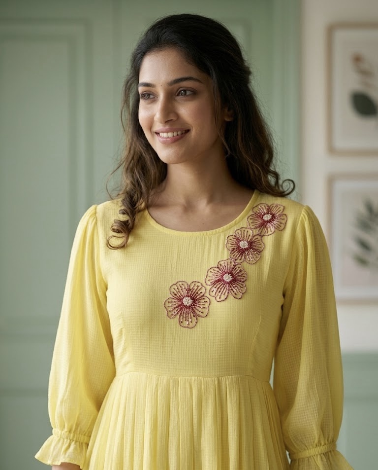 Pure Linen Kota Frock featuring subtle embroidery on the yoke for an elegant and minimal look. Crafted from lightweight and breathable linen kota fabric, this frock offers a soft, flowy silhouette perfect for everyday comfort and effortless style. The delicate embroidery adds a refined touch while keeping the outfit classy and versatile.