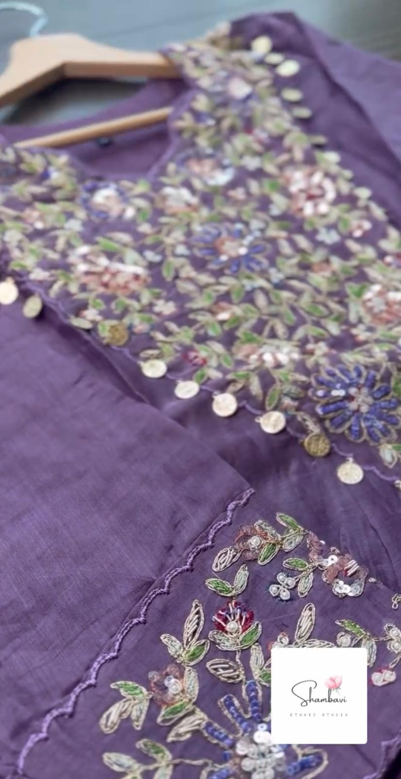 purple Pure Mul Chanderi three-piece A-line suit
