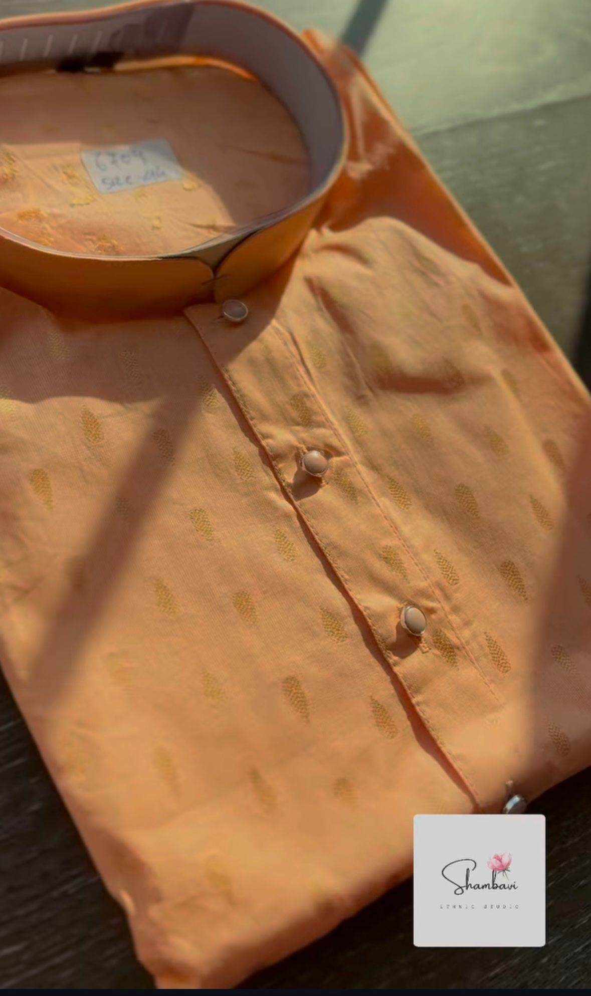 Crafted from lightweight orange cotton, this stylish men’s kurta boasts a striking gold buttu design all over. Perfectly complemented by matching white pajama pants, it offers both comfort and elegance. Elevate your wardrobe with this unique blend of colors and textures.