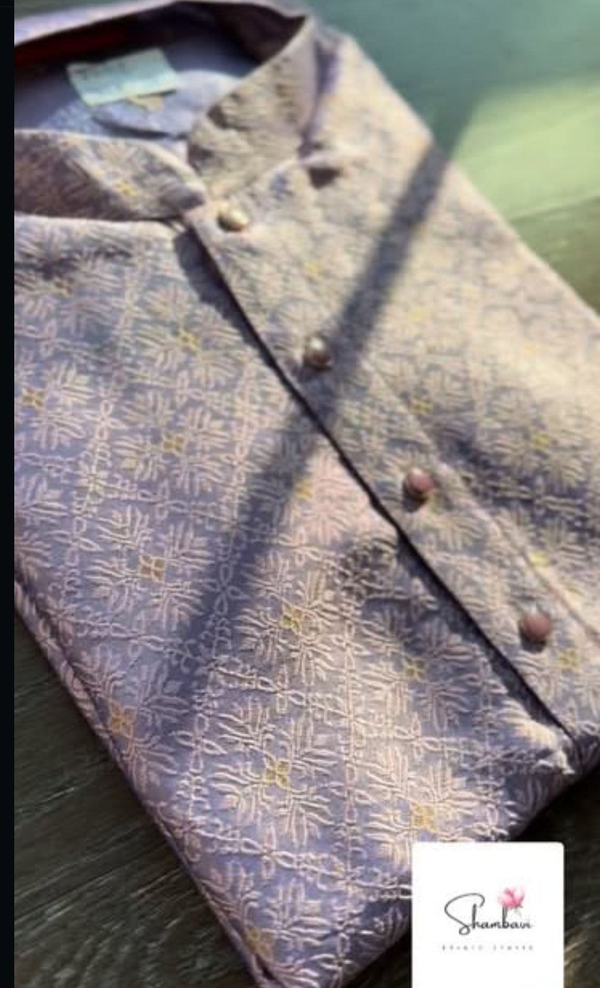 Crafted from premium men’s designer silk, the Vivid Violette dual shade kurta features a stunning self-designed all-over pattern. Accompanied by elegant white pajama pants, it offers both comfort and style. Perfect for special occasions or everyday elegance.